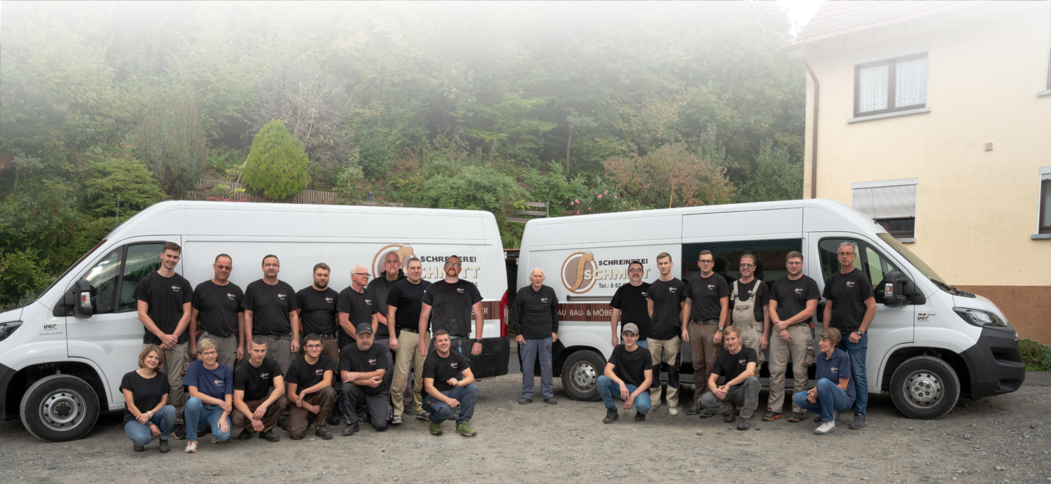 Wir sind ein wachsendes Team mit über 20 Mitarbeitern. Wir sind Schreiner, Lageristen, Auszubildende und Meister. Geleitet von unserem Geschäftsführer Hans Schmitt (Bild rechts außen) arbeiten wir organisiert in vier Abteilungen: Werkstatt, Lager, Montage und Büro. Wir planen und bauen Lösungen aus Holz für Privatkunden und Geschäftskunden aus verschiedensten Branchen.